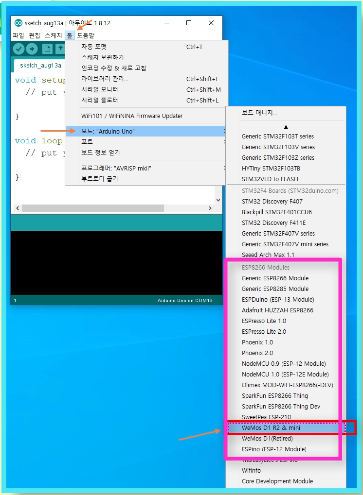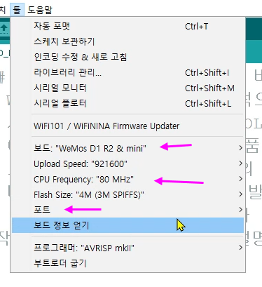 그럼, 그중에서 'WeMos D1 R2 & mini' 보드를 선택하면, IDE에서의 설정은 끝나게 됩니다.