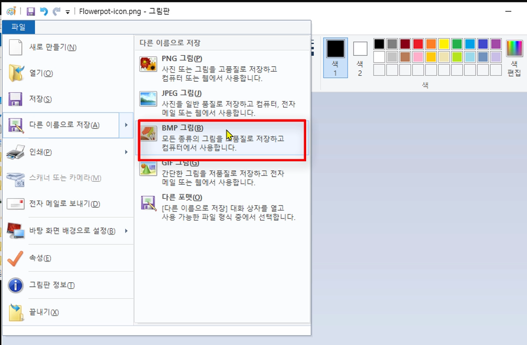 4. '파일 》 다른 이름으로 저장' 메뉴에서 'BMP 그림'을 선택하세요.