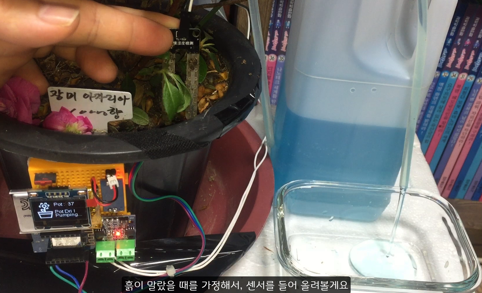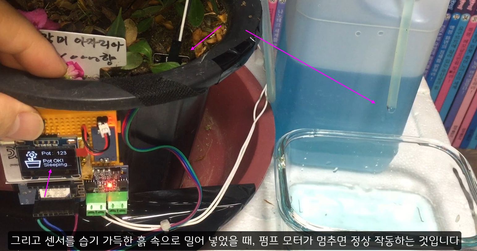 센서 값이 코드에서 정한 값 이하로 내려가면, 곧바로 펌프 모터가 작동해서 물이 나오는지 보세요.