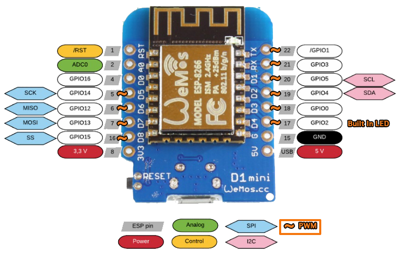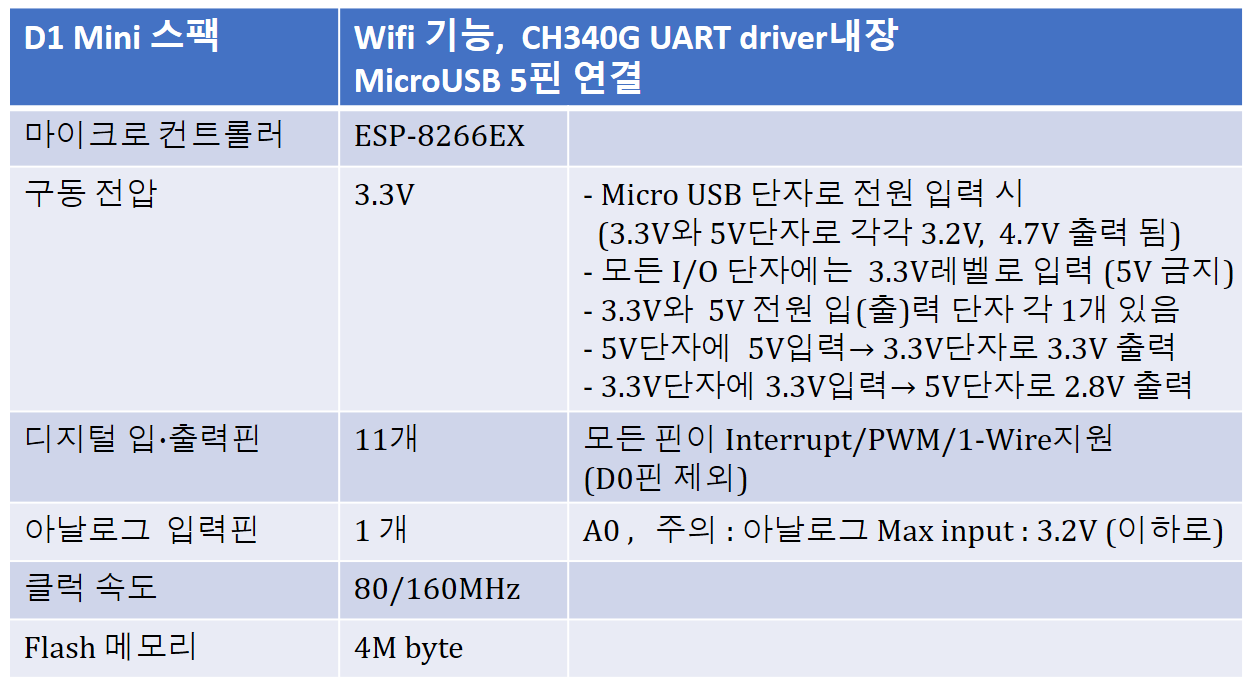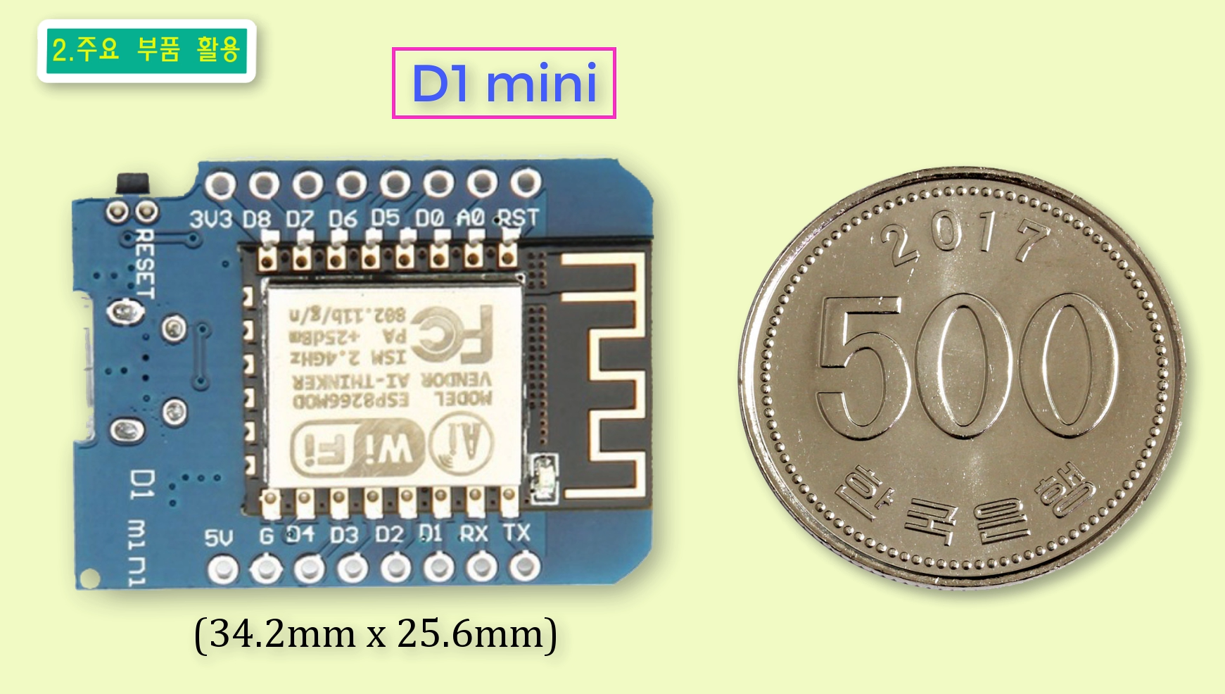 D1 mini의 가장 큰 장점은 크기가 작고 WiFi 기능을 사용하면서도, esp-01 모듈보다 여유 있는 입출력 포트와 함께 강력한 성능을 발휘한다는 점입니다.