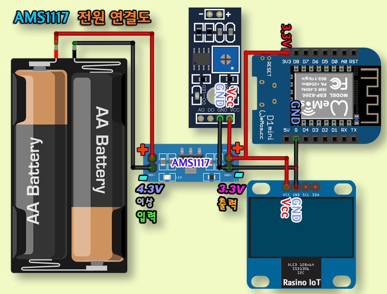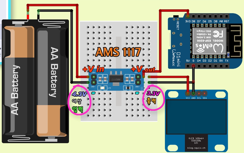 아래는 AMS1117을 사용하여 3.3V 전원을 필요로 하는 기기에 연결하는 방법을 보여드립니다.