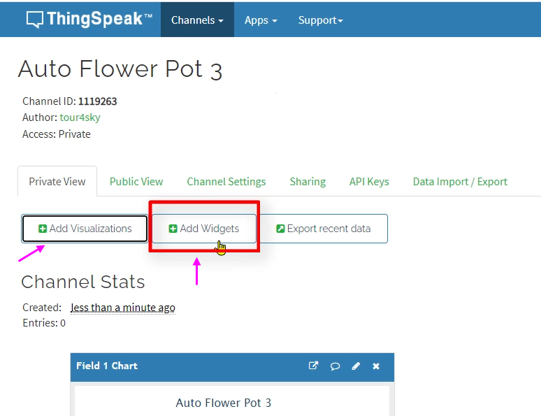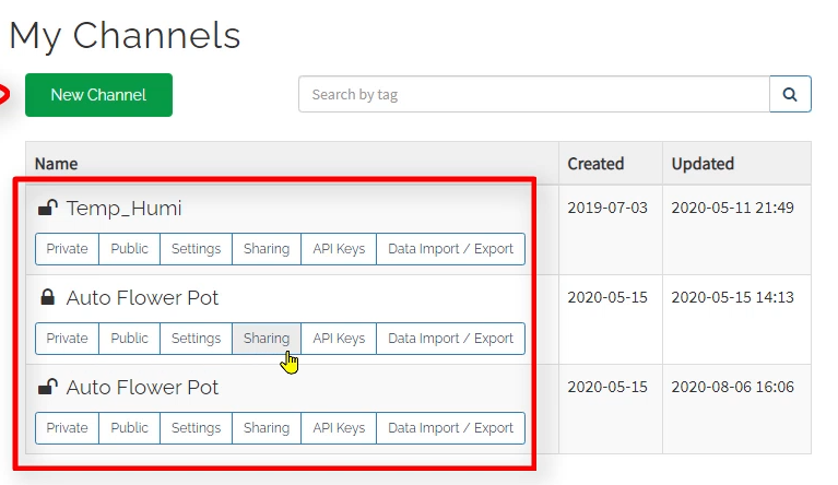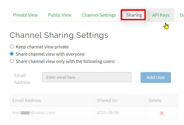 " Private " 채널은 본인만 확인할 수 있는 채널이며, " Public " 채널은 측정 데이터를 외부에 공개할 수 있는 채널입니다.