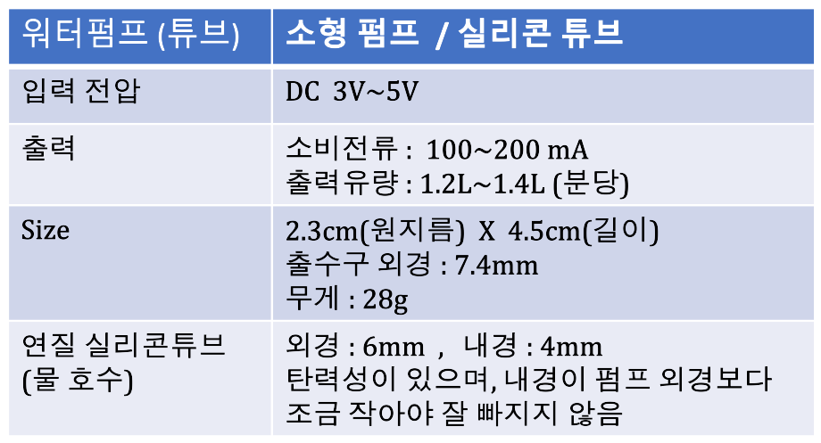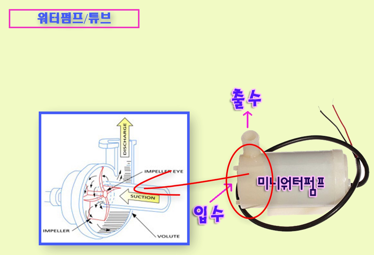 워터 펌프는 전원을 넣으면, 모터 끝에 연결한 날개형태의 임펠러가 회전하면서 물을 '입수구'로 빨아들여서, '출수구'로 배출하게 됩니다. 펌프 종류에 따라 다른데요, 화면과 같은 펌프는 물속에 잠기게 하여 작동시켜야 하며 물 밖에서 테스트할 때는 너무 오래 작동시키지 않아야 합니다. 물속에서 작동되는 이유로 모터 회전에 따른 과열을 상쇄해 주는 점을 고려해 만들었기 때문입니다.