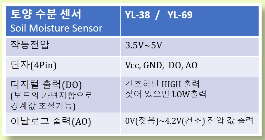 토양수분 센서는 측정 단자로 전류를 흘려서 되돌아오는 전류량으로 저항값을 알아내고 모듈의 A0 단자를 통해 저항값에 대응하는 0~4.2V 사이의 전압을 출력해 주는 모듈입니다.