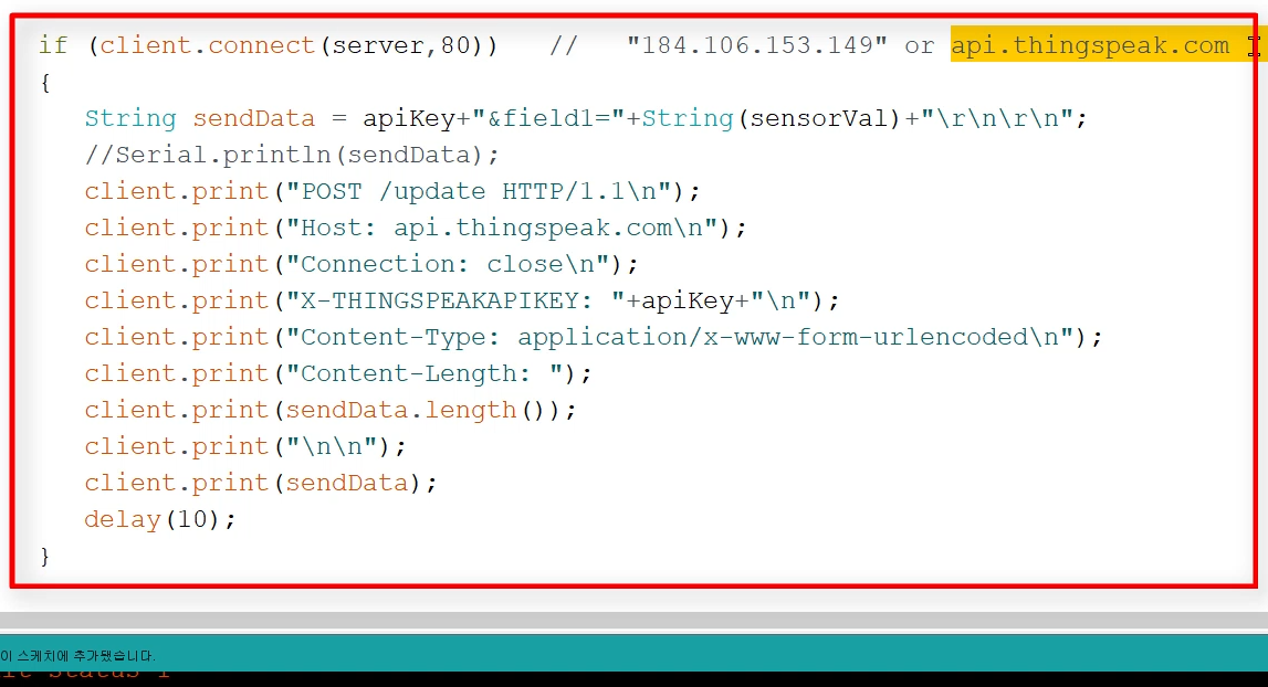 아래 부분이 'thingSpeak 클라우드 서버'로 접속해서 정보를 전달해 주는 부분입니다.