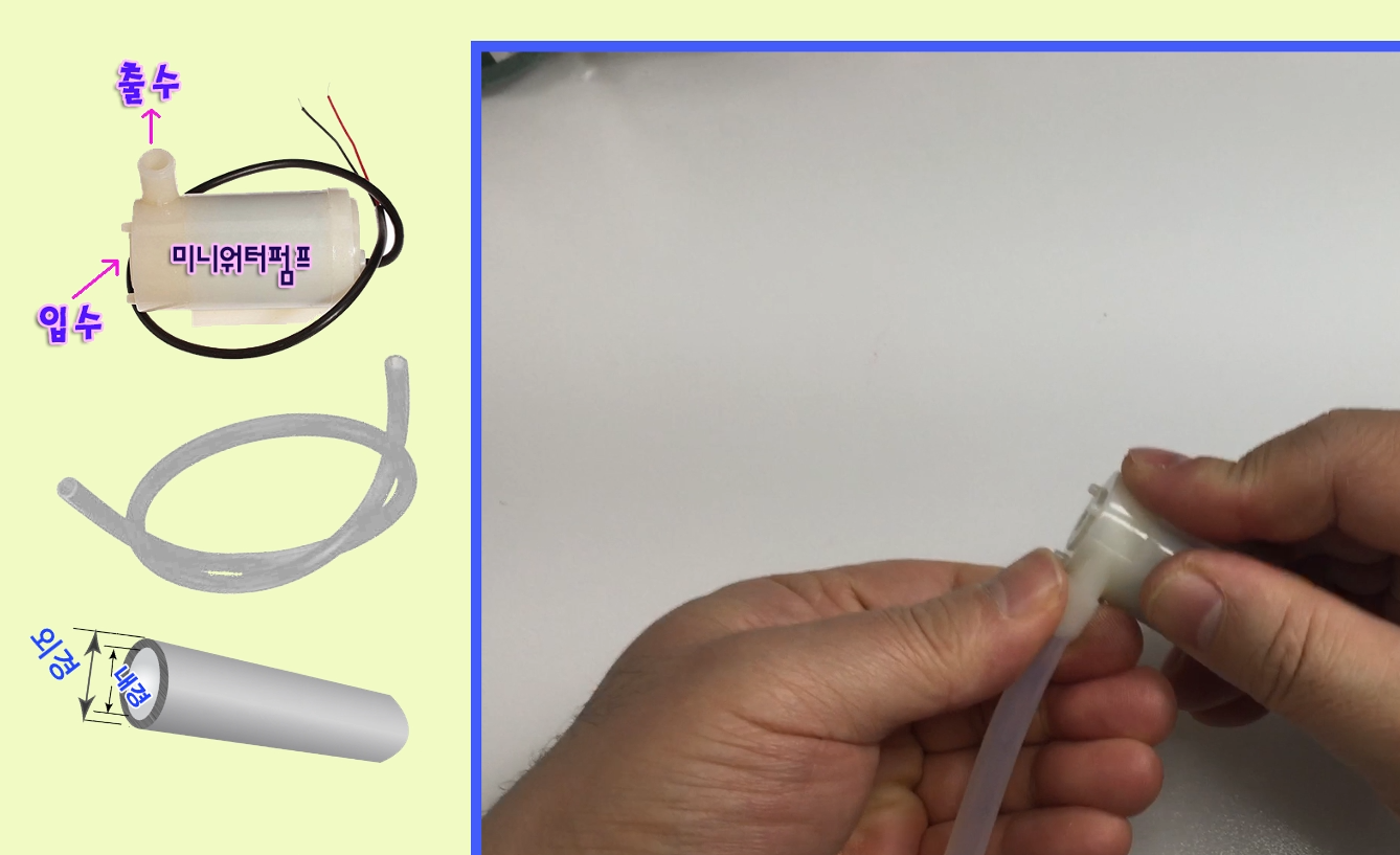 튜브의 내경은 펌프 출수구의 외경보다 조금 작은 것을 선택해야 물의 수압으로 인해 쉽게 빠지지 않습니다. (튜브를 벌려 출수구 바깥으로 끼워주세요)