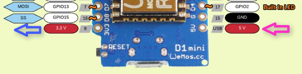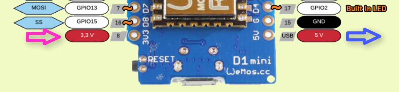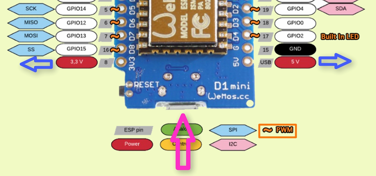 그럼, 보드 전원 관련하여 정리해 드릴게요. 'D1 mini' 보드는 '마이크로 5핀' 케이블을 이용하여 전원을 공급받고 PC와 통신도 할 수 있는데요, micro 5핀 단자로 전원이 공급되면, 5v 단자로 5v , 3.3v 단자로는 3.3v가 각각 출력됩니다.