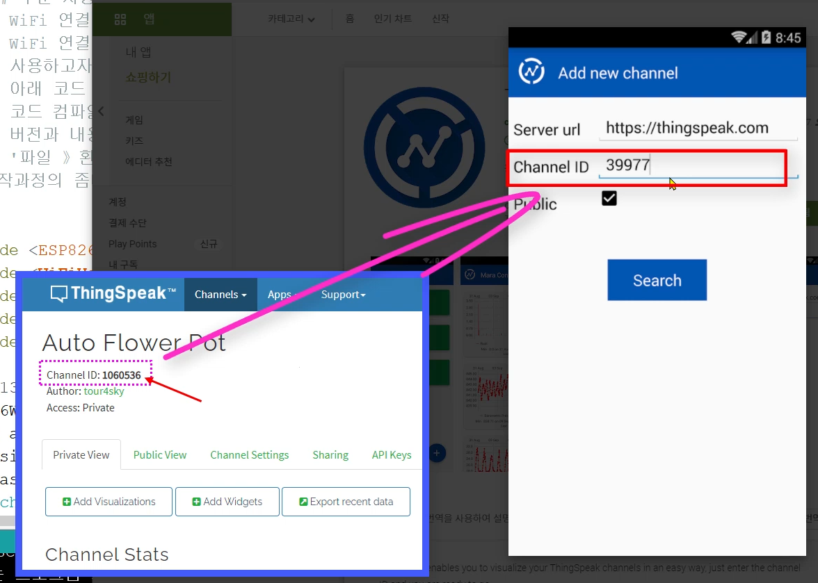 구글 플레이스토어에서, " thingspeak "로 검색해서 앱을 다운로드해 설치하세요.