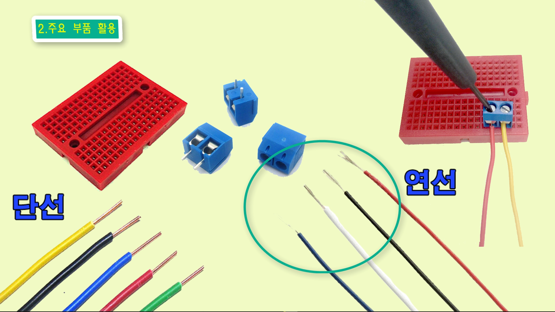 단선은 내부의 선이 하나의 굵고 단단한 선으로 되어 있어 '브레드보드'에 직접 꽂기가 편하지만 연선은 여러 가닥의 얇은 선으로 되어 있어 잘 휘어지기 때문에 영상과 같은 터미널 단자를 이용하면 쉽게 '브레드보드'에 연결할 수 있습니다.