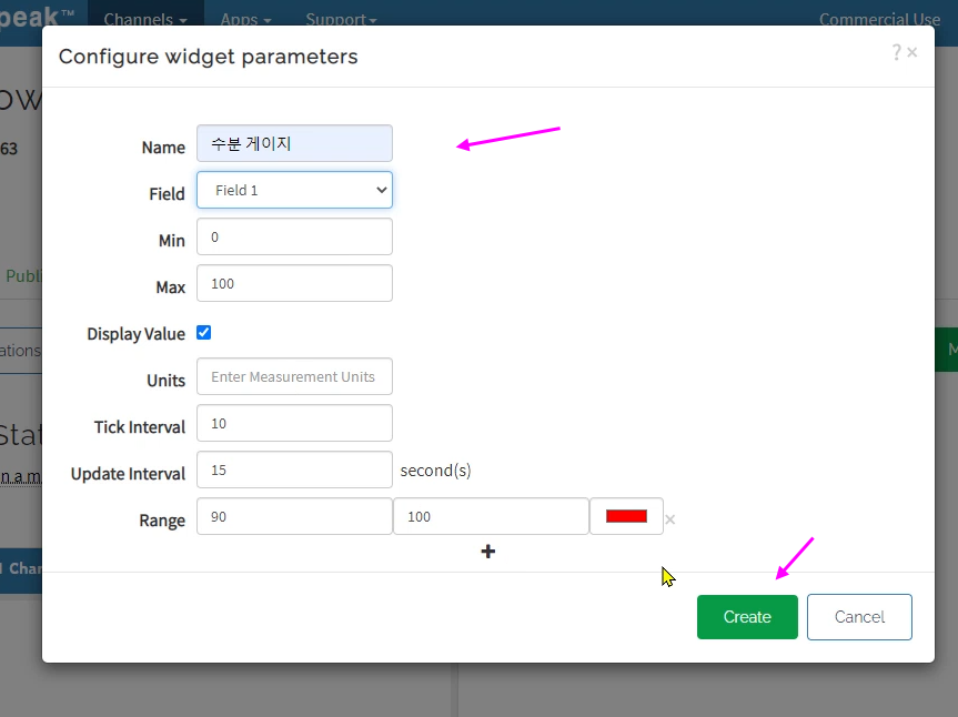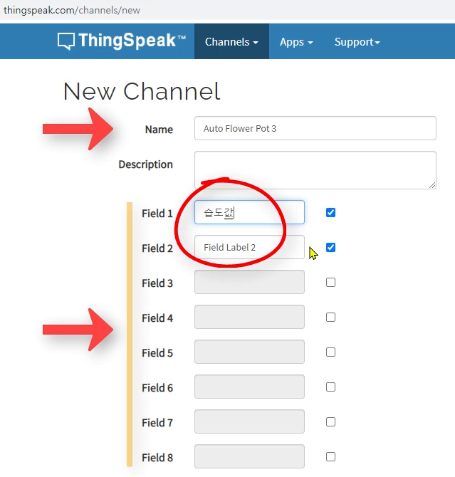 반드시 필요한 항목은, "새 채널의 이름" 항목과, 데이터를 표시할 항목(Field)만 입력하면 됩니다.
