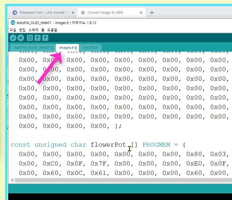 아래 이미지처럼 이미지가 C언어 기반의 데이터 배열로 변환 된 것을 알 수 있습니다.