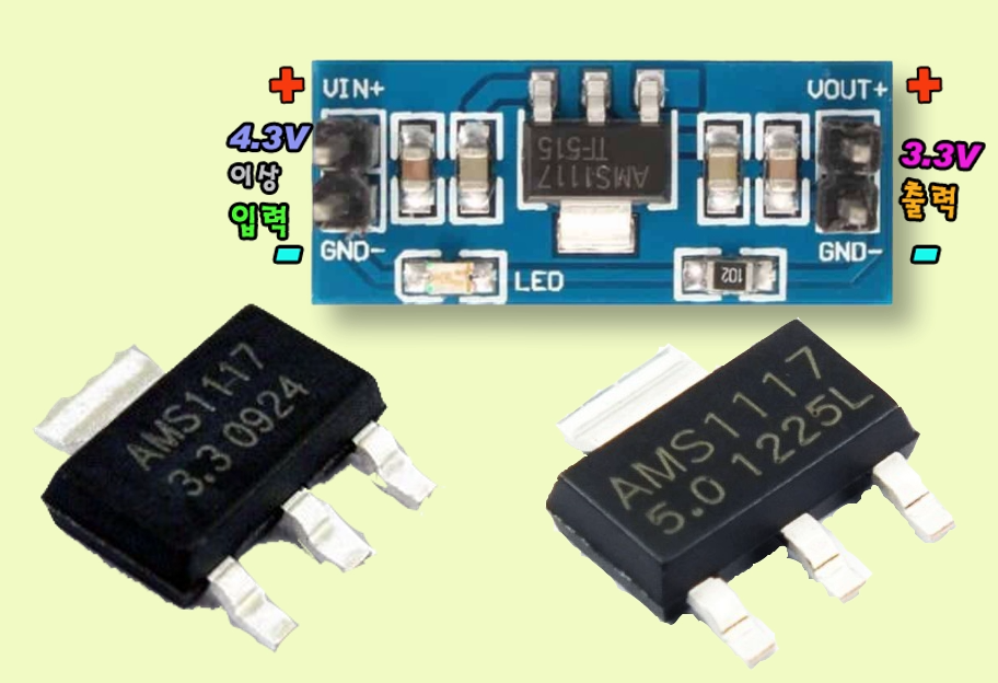 AMS1117레귤레이터는, 3.3V 정전압 출력용이 있고, 5V 정전압 출력용이 있습니다.