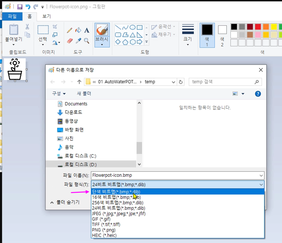 5. '파일형식' 옵션에서 '단색 비트맵'으로 선택하고 저장 버튼을 클릭하세요.