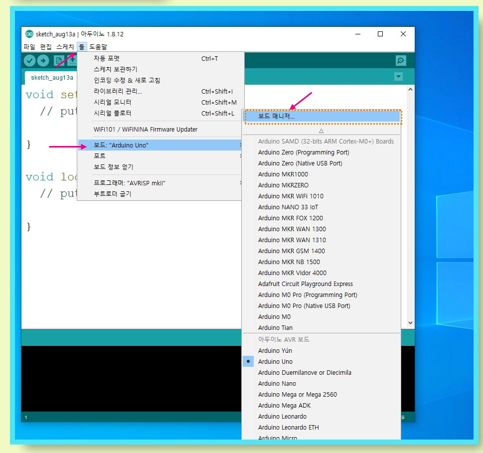 그리고, '툴 》보드 》보드매니저...' 항목을 열어서 검색창에 'esp8266'으로 검색하세요. 검색된 'esp8266' 보드 패키지를 설치해 주면, IDE에 'esp8266' 관련 보드 메뉴들이 추가됩니다.