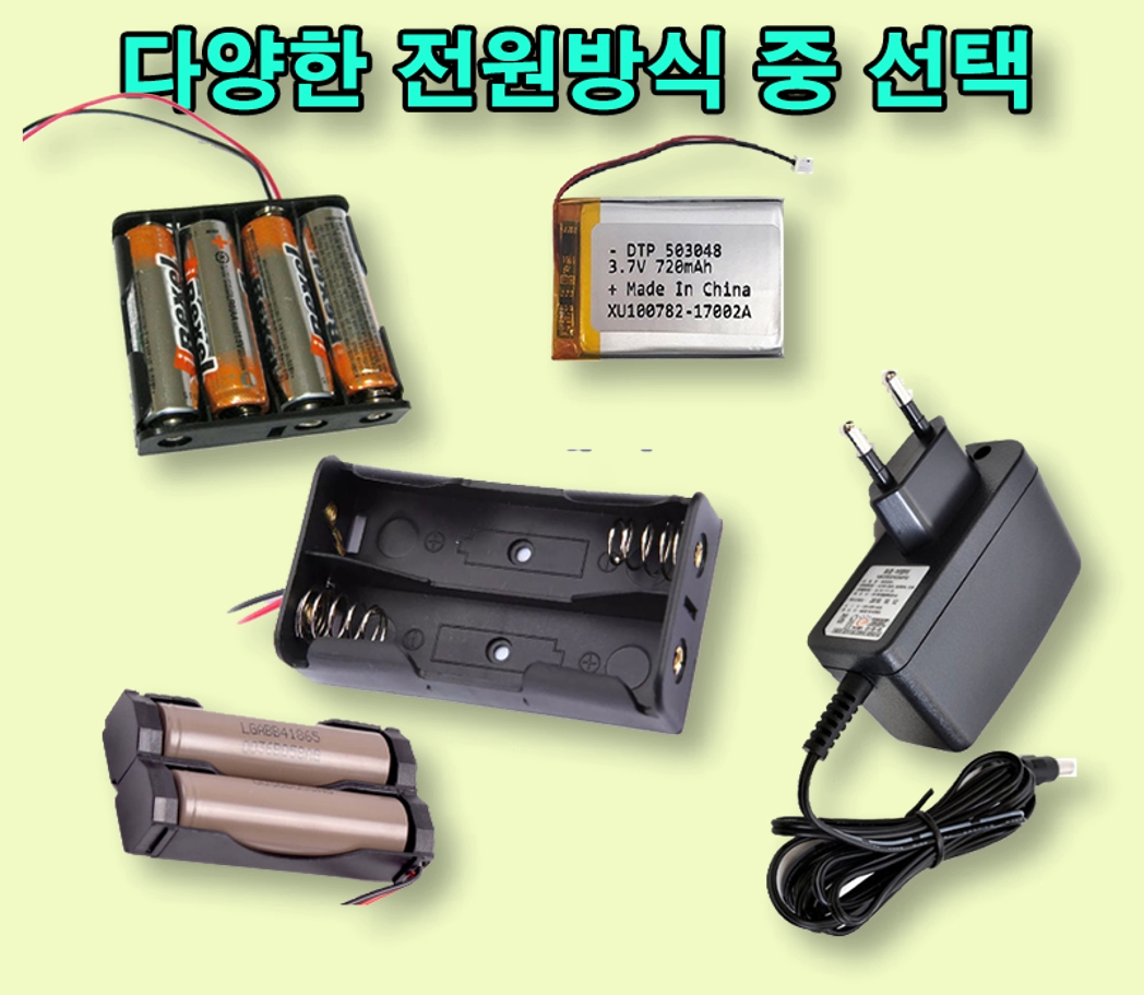 배터리를 연결할 경우, 생각보다 오래 가지 못합니다. 실제로, '리튬폴리머', '18650 리튬이온' 등의 배터리로 테스트해본 결과, 배터리 용량에 따라, 1일~3일 정도 작동된 후 배터리가 소진되었으니 참고하세요.