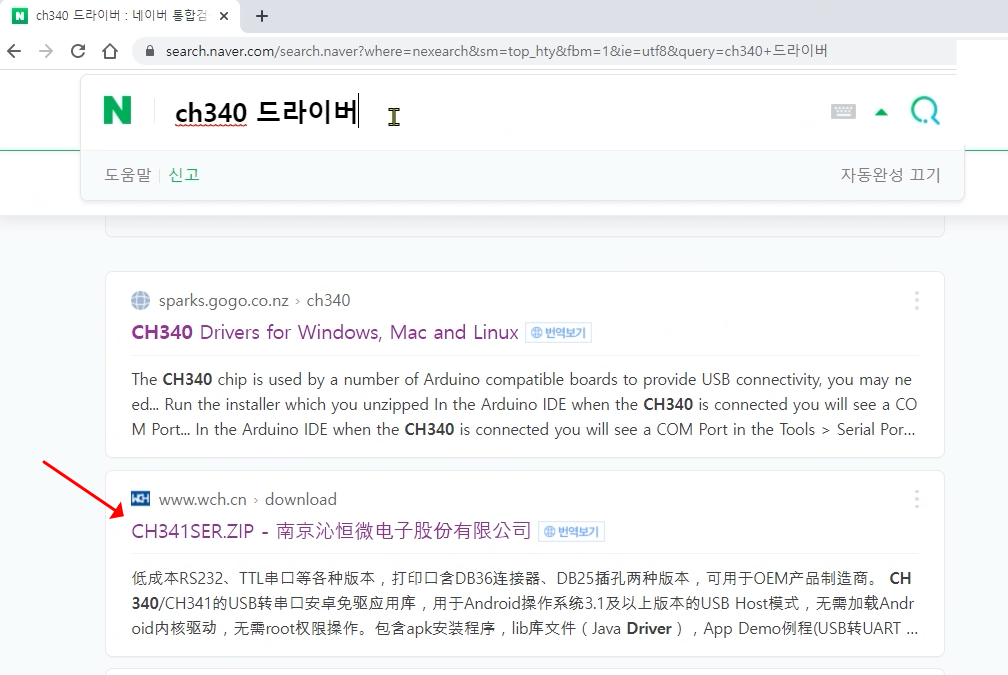 그게 아니라면 아래처럼 "CH340"으로 구글 검색 후 아래 보이는 중국어 사이트를 여세요.
