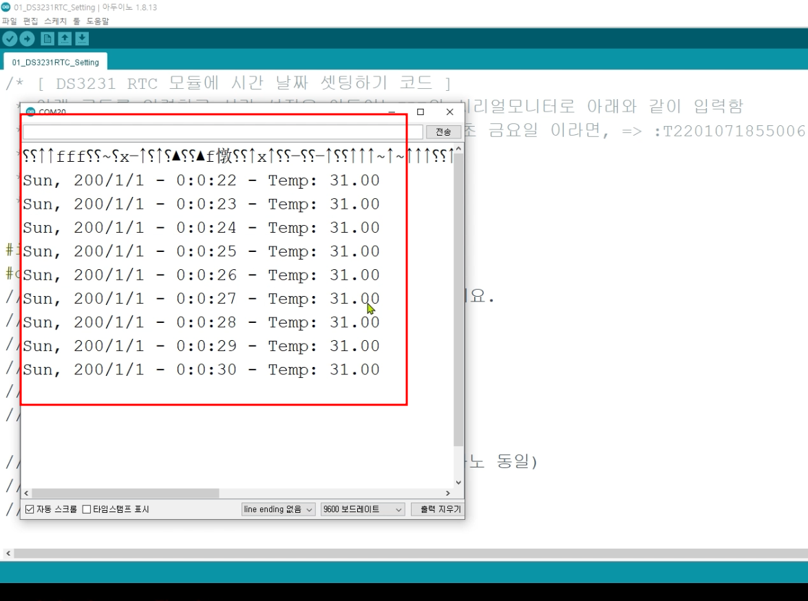 년, 월, 일, 시, 분, 초와 온도 등 DS3231에서 추출할 수 있는 모든 데이터를 출력해 볼 수 있습니다.