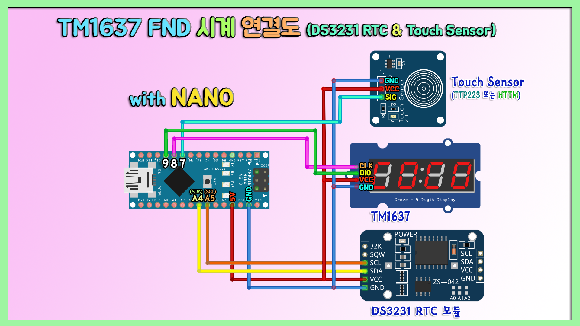 1번. TM1637 모듈과 터치 센서를 사용한 회로 연결은 아래와 같이 합니다.