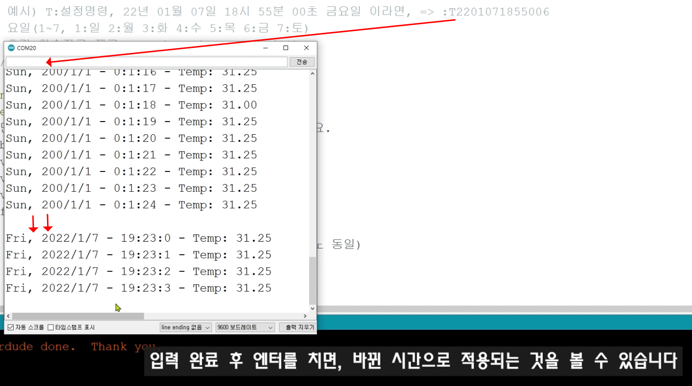 예를 들어, 먼저 시리얼 모니터 입력창에 T를 입력하고 22년 01월 07일 19시 23분 00초, 금요일 6 형태로 입력합니다.