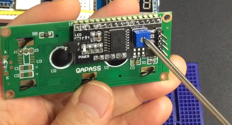 만약, LCD에 불은 들어오지만 데이터 표시가 안 되는 경우가 있다면 지금처럼 LCD 뒷면에 있는 반고정저항 값을 좌 또는 우로 조금씩 조절해 보세요.