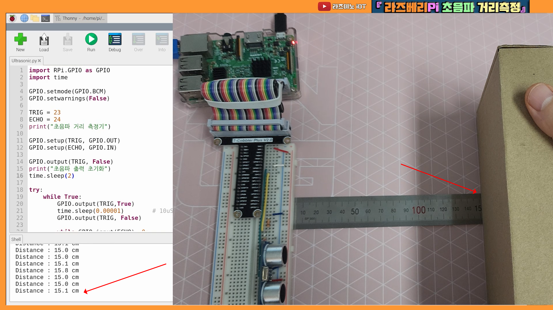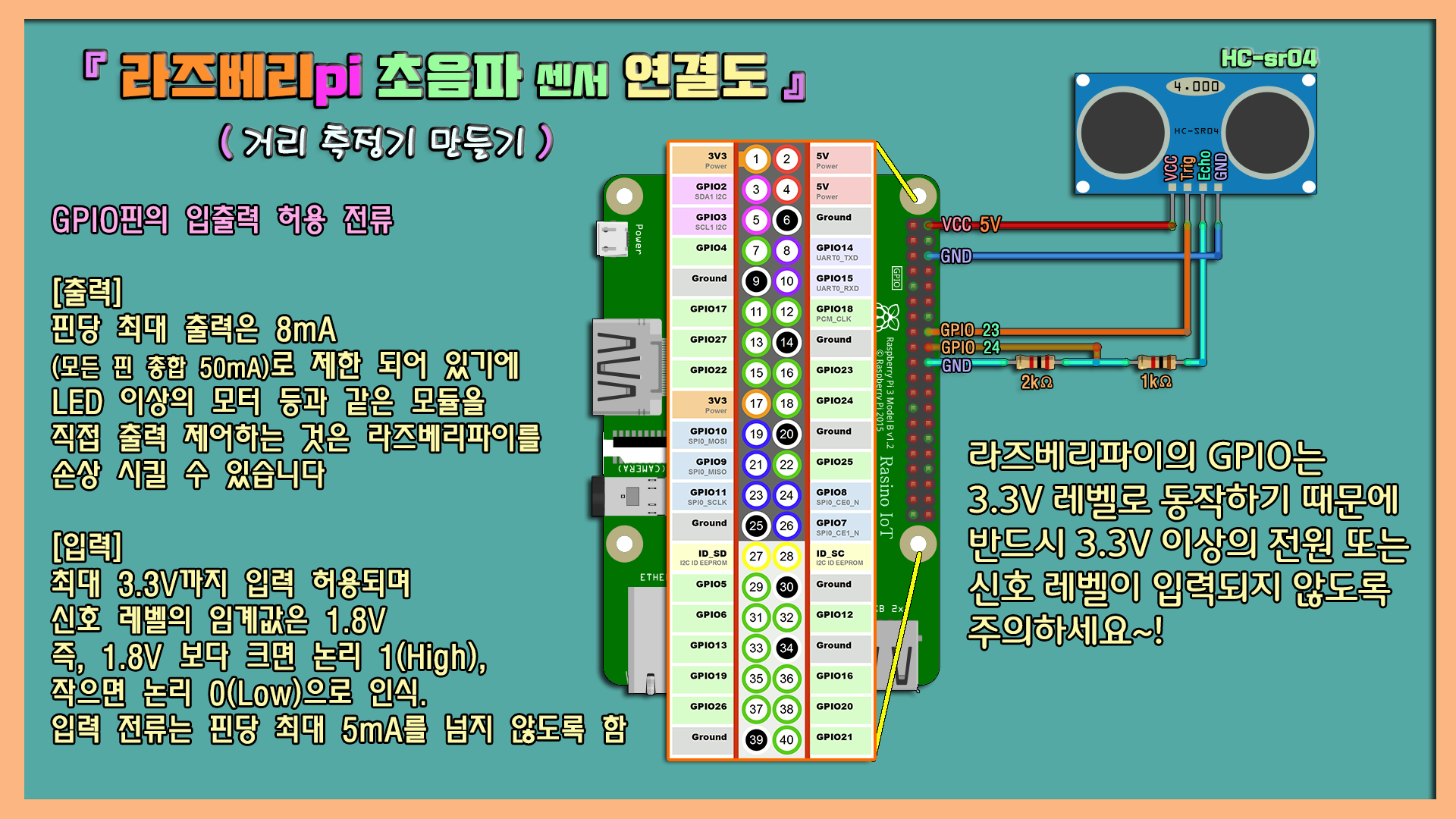 네, 이렇게 라즈베리파이에서 초음파 센서(sr-04)를 연결하고, 응용 예시로 거리측정까지 다루어 보았습니다.