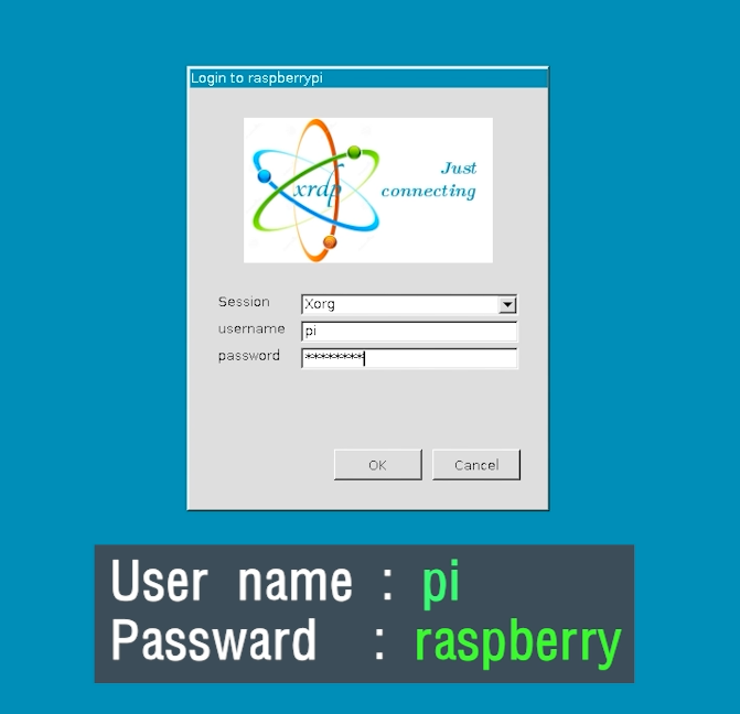 일반적으로 User 이름과 패스워드를 특별히 다른 것으로 변경하지 않았다면, 아이디는 pi , 비번은 raspberry입니다.