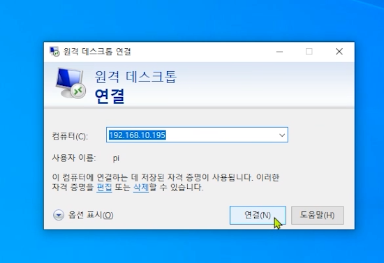 컴퓨터 항목에 라즈베리파이가 할당받은 IP주소를 입력하고 연결을 클릭하세요.