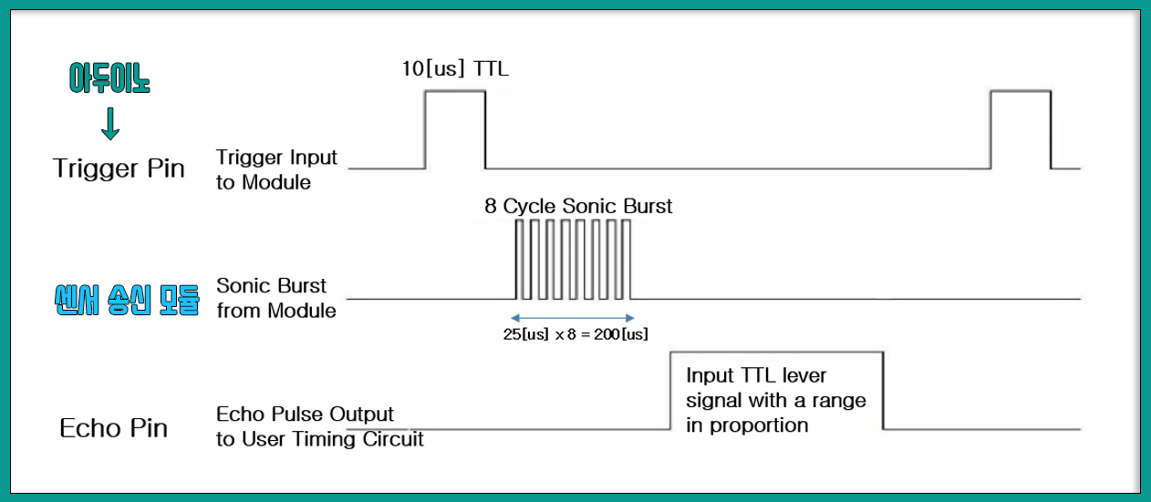 아두이노에서 초음파 센서의 Trigger Pin으로 10us의 펄스 신호를 입력해 주면, 초음파 센서의 송신 모듈에서 25us짜리 8개의 음파를 발사하게 되고, 이 음파가 물체에 부딪혀 수신 모듈로 되돌아올 때, 에코 핀에서는 그 시간 동안만 High 신호를 출력하게 됩니다.