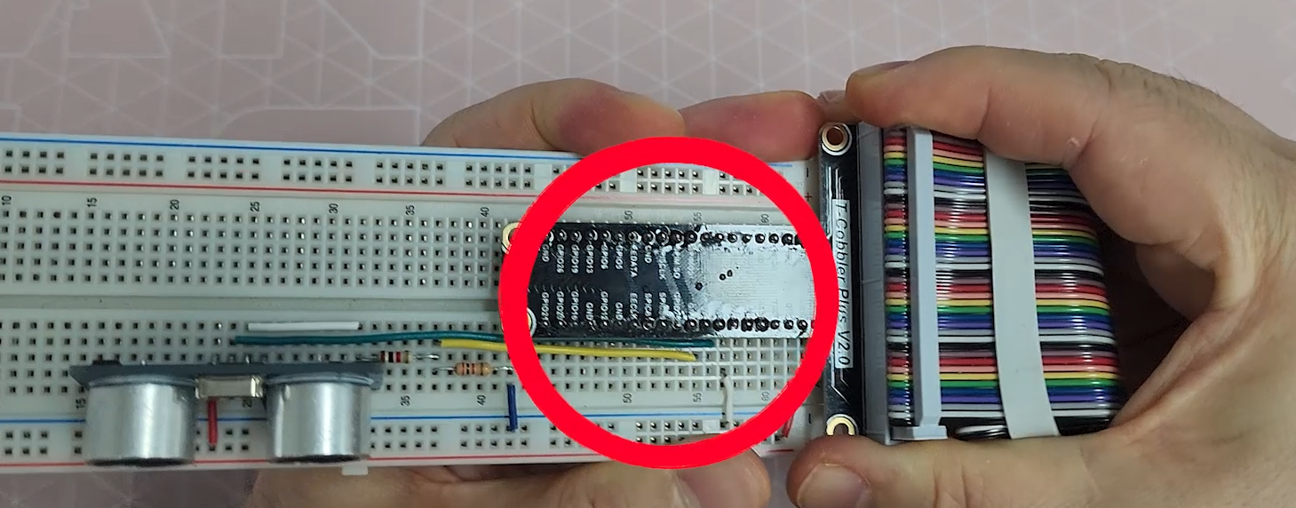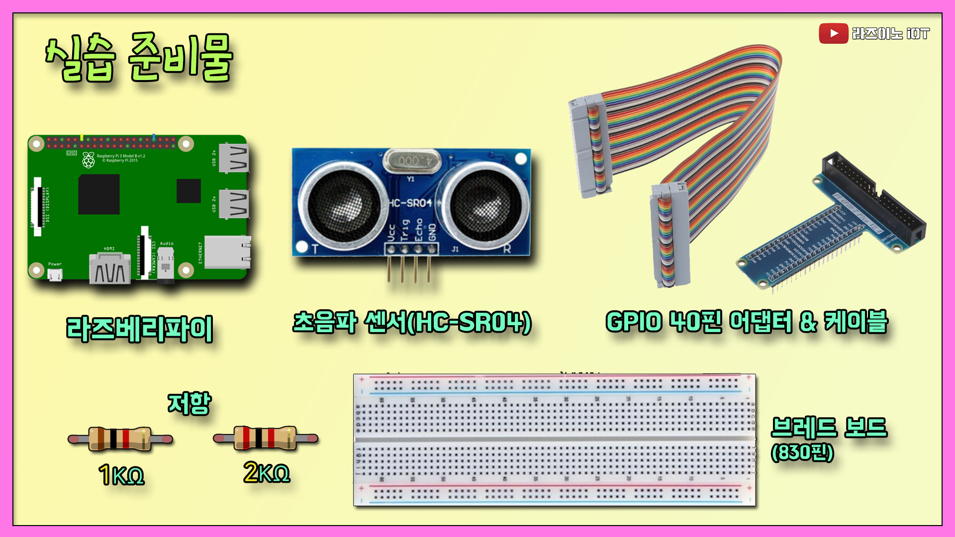 위 이미지는 라즈베리파이 초음파 거리측정 회로 연결 도면입니다. 연결 도면을 보고 부품들을 연결해 주세요.