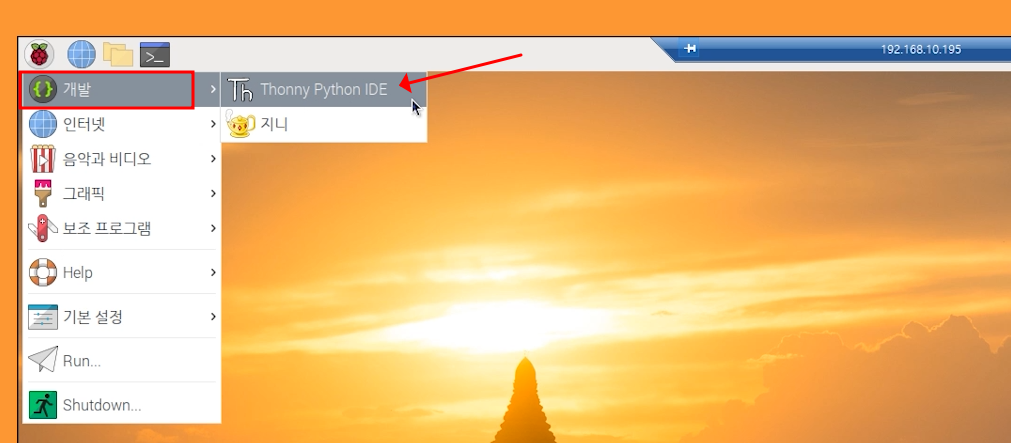 그럼 이제, 개발 메뉴에서 Thonny Python IDE를 실행합니다.