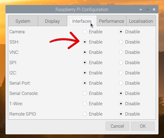 Interfaces 메뉴로 들어가서 (SSH)를 Enable로 체크해 주세요.