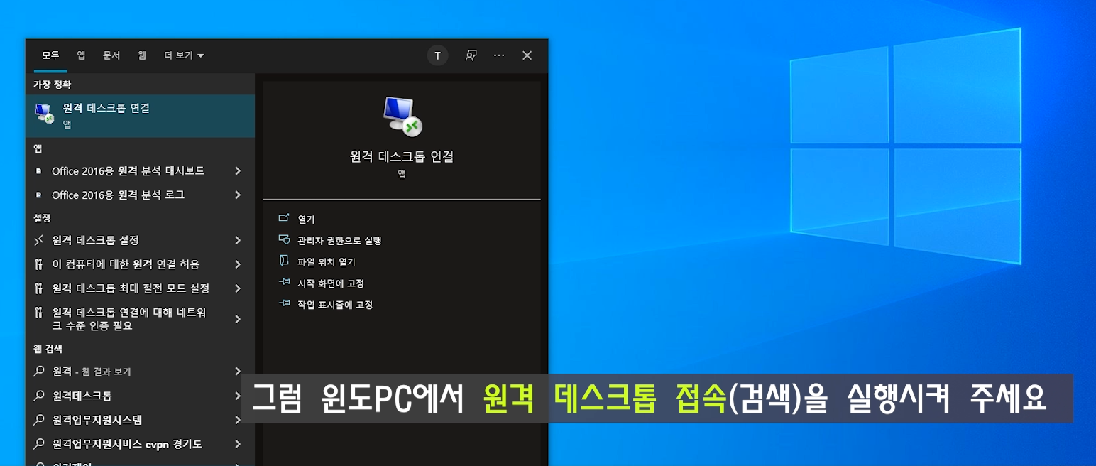 그럼 윈도 PC에서 원격 데스크톱 접속(검색)을 실행시켜 주세요. (라즈베리파이에서 직접 실행시키는 분은 상관없습니다)