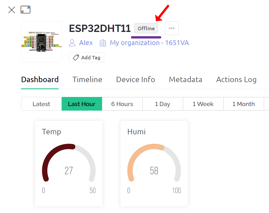아래 온습도 프로젝트를 ESP32를 이용하여 만든, 블링크 클라우드(Blynk Cloud)의 화면을 보면 Off Line으로 나와 있는 것을 볼 수 있습니다. 물론 ESP32 보드는 스마트폰 핫 스팟이나 기타 WiFi 라우터 등에 잘 연결되어 있는 상태입니다.