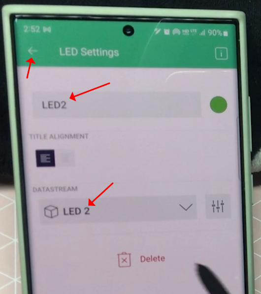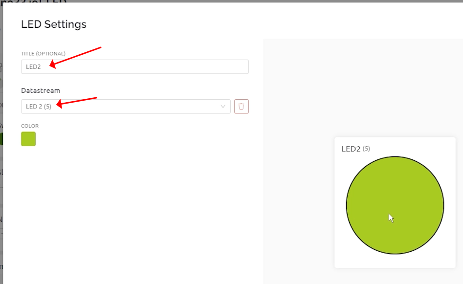 제목 : LED 2 / 색 : 그린 / DataStream : LED 2로 선택하세요.
