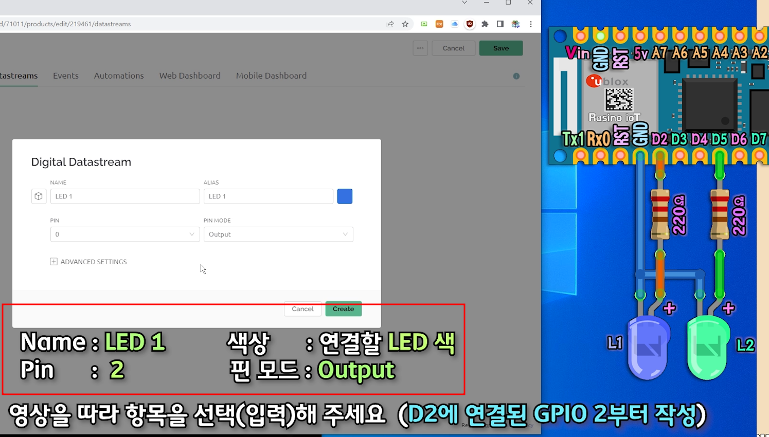 TITLE에 LED 1로 적고, Data Stream에는 2번 Pin으로 지정된 LED 1(2)을 선택해 주세요