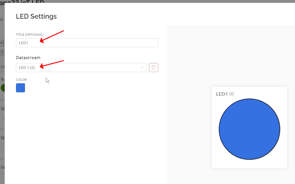 제목 : LED 1 / 색 : 블루 / DataStream : LED 1로 선택하세요.