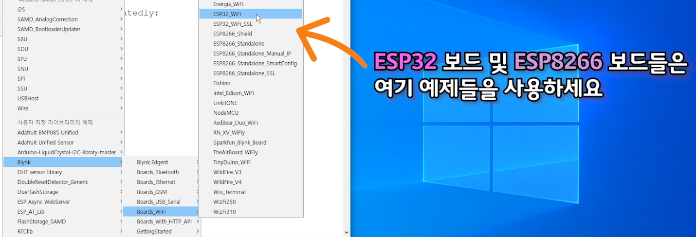 이제 ‘파일 》 예제 》 Blynk’ 메뉴에서 → ‘Boards_WiFi’항목으로 가서, Nano 33 ioT와 동일하게 사용할 수 있는 → ‘Arduino_MKR1010’ 예제를 열어 사용합니다.