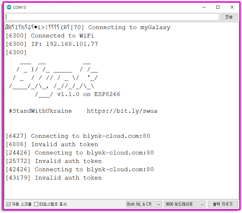 만약, 대시보드에 표시가 Off line 이거나, 아래처럼 아두이노 시리얼 모니터에 “Invalid auth token”에러 메시지를 띄우며 실행되지 않는다면, 작동되지 않습니다.