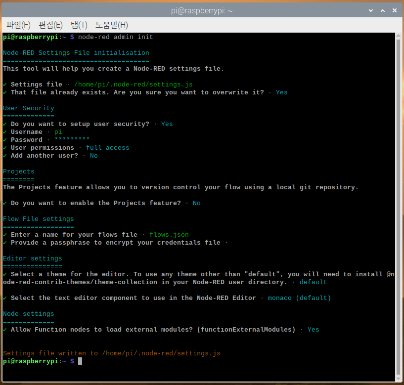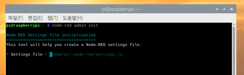그리고 Node-RED 네트워크 사용자 추가나 Node-RED 기본 환경설정은 아래 명령어로 설정해 주면 되는데요,
