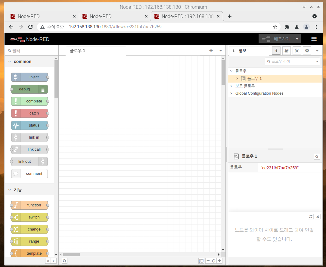 혹은 ip를 직접 입력하여 http://192.168.138.130:1880 또는 http://192.168.138.130:1880/ui로 입력하면 아래처럼 Node-Red 에디터(편집) 창이 나타나는 것을 볼 수 있습니다. 이 공간에서 플로우를 개발한다고 생각하면 됩니다.