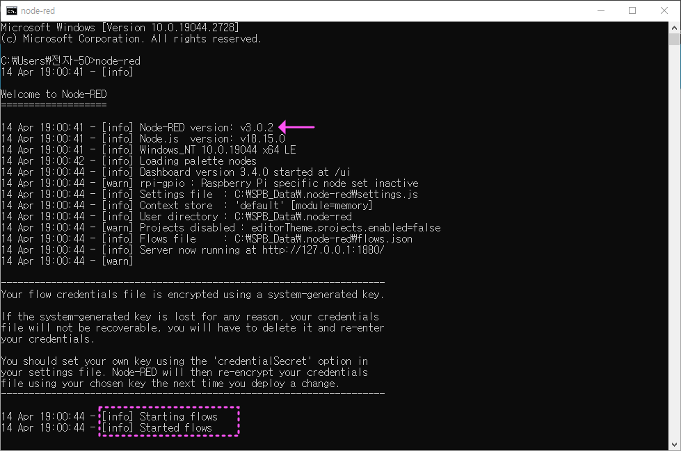 참고로, 윈도에서 Node-RED 실행은 아래 이미지와 같이 "node-red"를 입력하면 됩니다. Node-RED의 버전확인도 가능하고 Starting flows라고 표시되는 것을 확인할 수 있습니다.