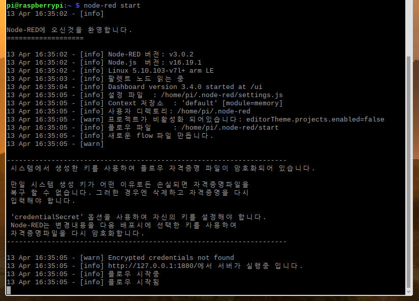 ▶ node-red의 서비스 시작은 아래 명령어로 시작하면 됩니다.