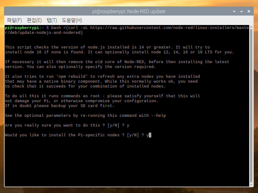 하지만 이것과 상관 없이 아래 명령어를 이용하여 설치하면 기존 설치된 혹은 구버전 NodeJS와 Node-RED를 자동 제거부터 하고 설치가 진행되니 그대로 진행해도 됩니다.