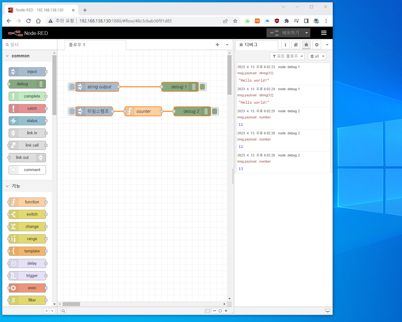아래는 NodeRED를 실행하고 간단한 문자(String) 출력과 함수 노드를 이용한 숫자 카운트를 해보는 모습입니다.