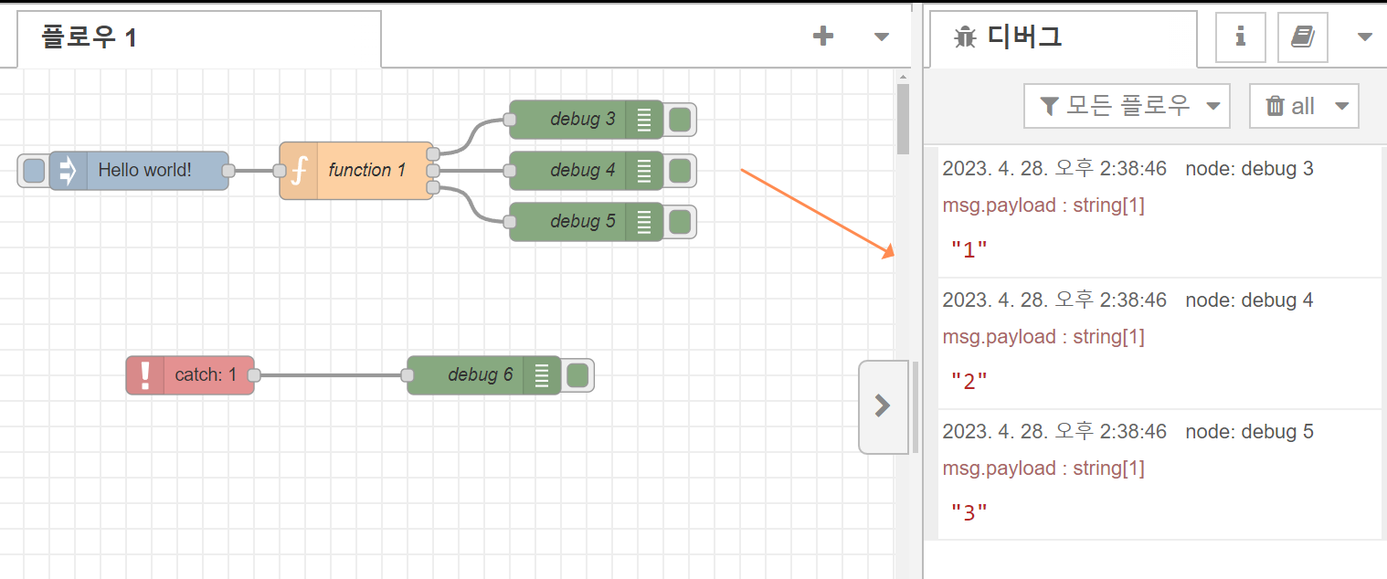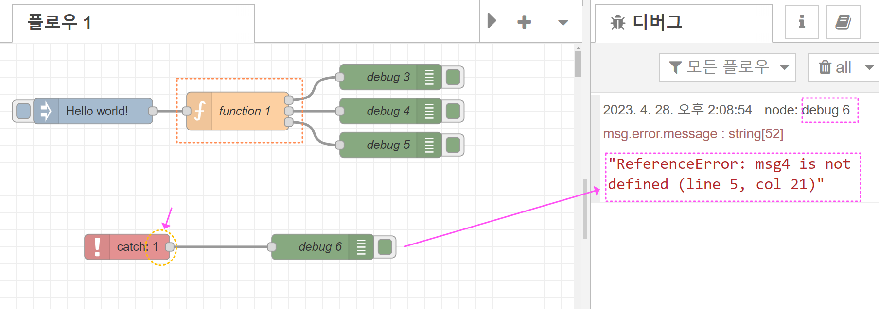 아래 이미지들은 Function 함수에서 에러를 발생시켜 이를 Catch노드에서 감지하도록 하여 에러 발생 내용을 debug 6 노드로 출력하도록 한 예시입니다.