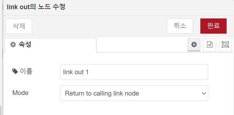 위와 같이 연결되기 위해서는 아래에 있는 Link Out노드와 Link In노드의 설정을 참고해 주세요.