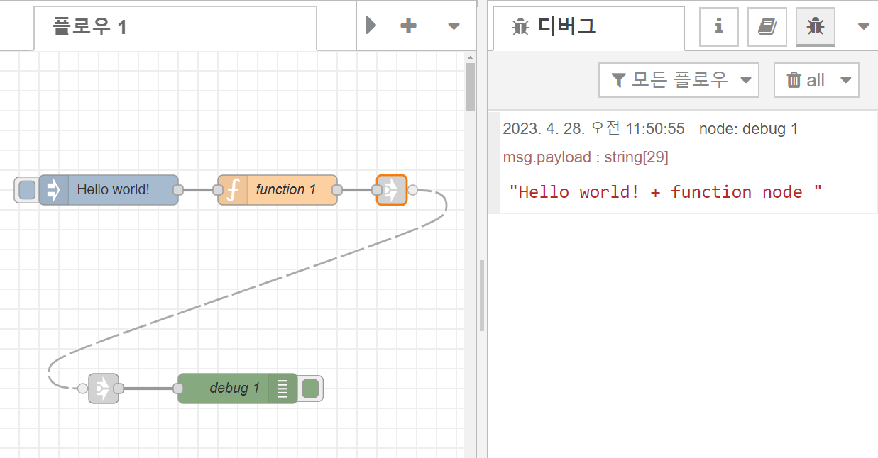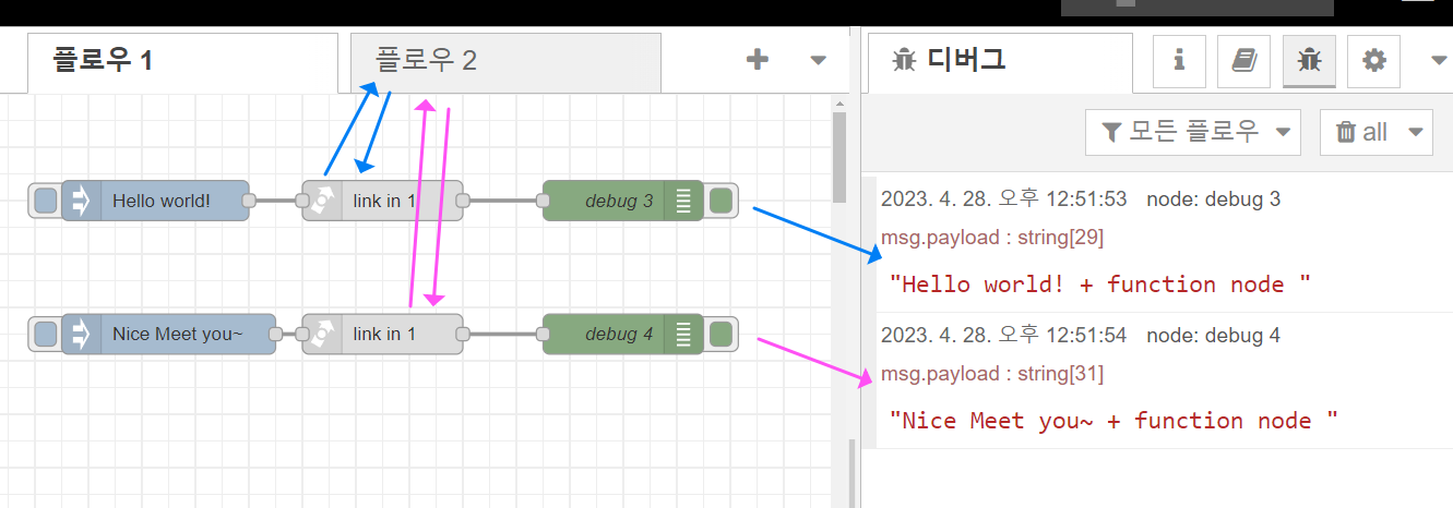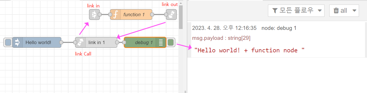 아래 예시를 보면, 인젝터에 있는 Hello world! 메시지와 Function 1의 메시지를 합친 출력을 "Link Out 1"노드 → "Link In 1"노드로 전달시켜 debug 1으로 출력시켜본 예제입니다.