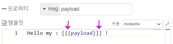 따라서 머스테치와 같은 템플릿 엔진을 사용한 템플릿 노드를 이용해서 사용자가 정의한 형태의 타입으로 메시지를 가공하는데 효과적으로 사용할 수 있는 노드입니다. 특히, HTML과 같은 웹페이지 출력 형태를 사용할 때 많이 사용하게 됩니다. 뒤에서 다루게 될 [http response] 노드와 함께, 웹으로 출력하는 것을 볼 수 있습니다.