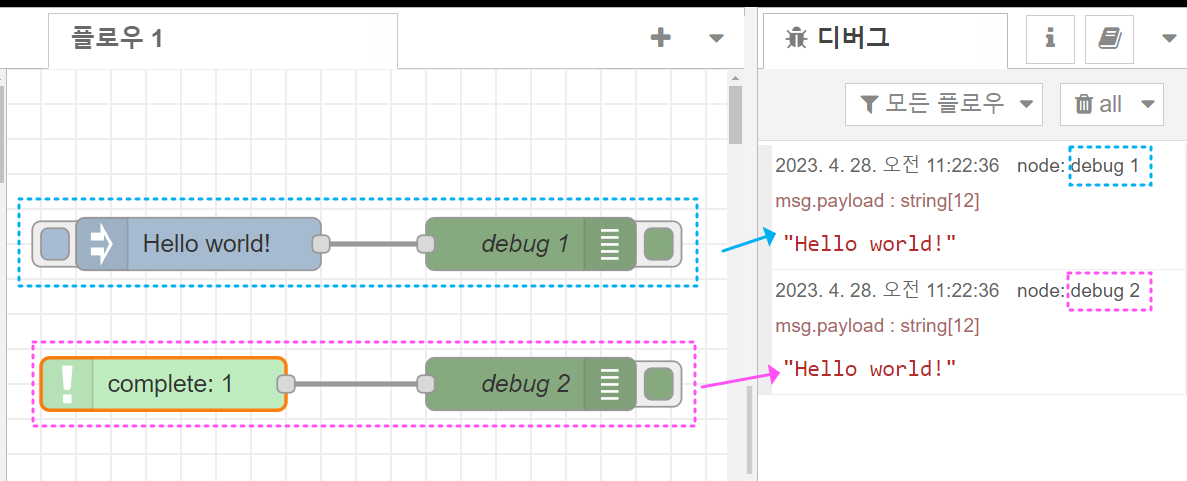 아래 예시에서 보면, Complete노드에서 "Hello World!" 메시지를 갖고 있는 인젝트(Inject) 노드의 출력 메시지를 감지하면 "debug 2"를 통해서 동일한 메시지를 출력할 수 있도록 하였습니다.