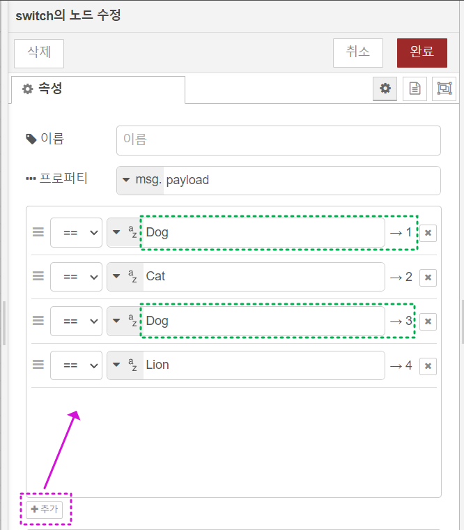 예를 들어, 인젝트(inject)에서 "Dog"라는 메시를 설정하고 switch노드에서 목적상 여러 개의 출력을 설정하였을 때, "Dog"라는 메시지와 동일한(==) 출력 노드로만 메시지를 보낼 수 있습니다. 즉 메시지에 일정한 규칙을 설정하여 Flow의 방향을 조절할 수 있습니다.